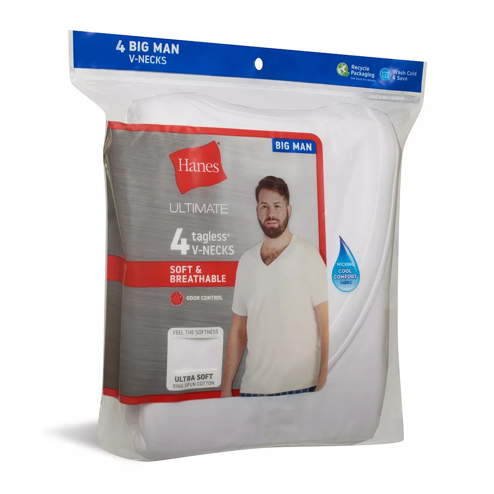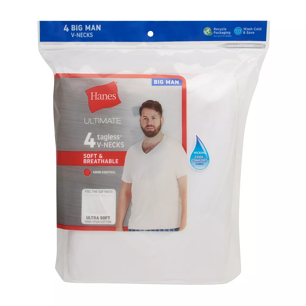 Our Hanes Ultimate® Big Man Collection is designed to give you a classic fit comfortable enough to wear all day. These men’s v-neck undershirts are Tagless® for itch-free comfort and have a durable collar that lays flat. They feature ample arm and neck openings for easier movement and roomy construction for a comfortable fit around your midsection. Hanes v-neck shirts are constructed with Cool Comfort® fabric along with FreshIQ™ Advanced Odor Protection technology to help keep your skin dry and odor-free. Our soft and breathable fabric is made with 100% ring spun cotton for ultimate long-lasting comfort.